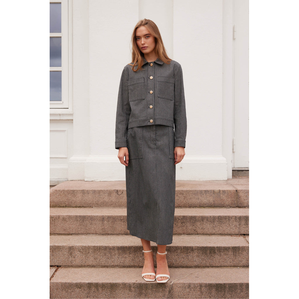 Smuk midi nederdel designet med en bred pasform og forlommer. Derudover er nederdelen med knap- og lynlåslukning foran.