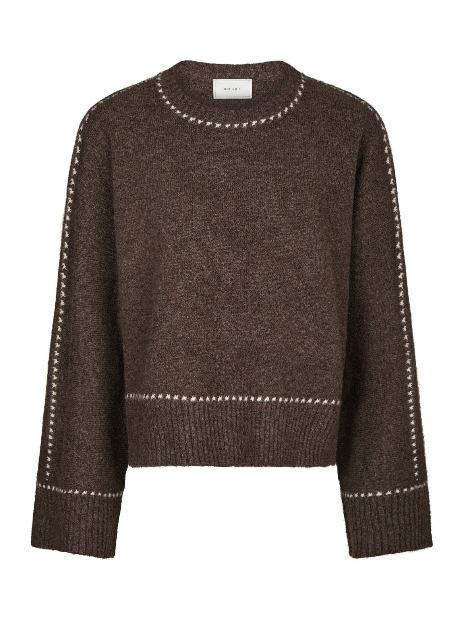 Synlige stikninger ved halsudskæringen, ærmekanterne og trøjens bund.